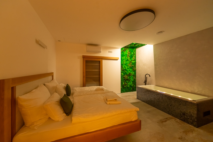 The apartment can also be used for a family with children, as the rooms can be separated by glass doors. The bathroom is equipped with a shower and a toilet.