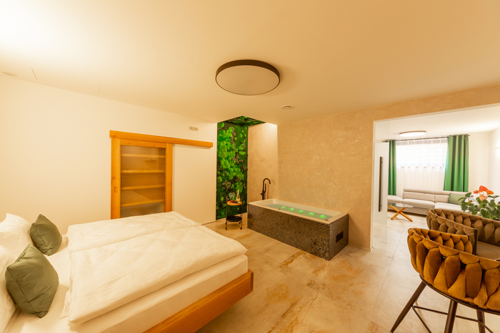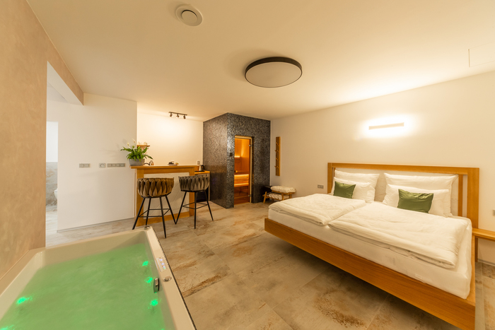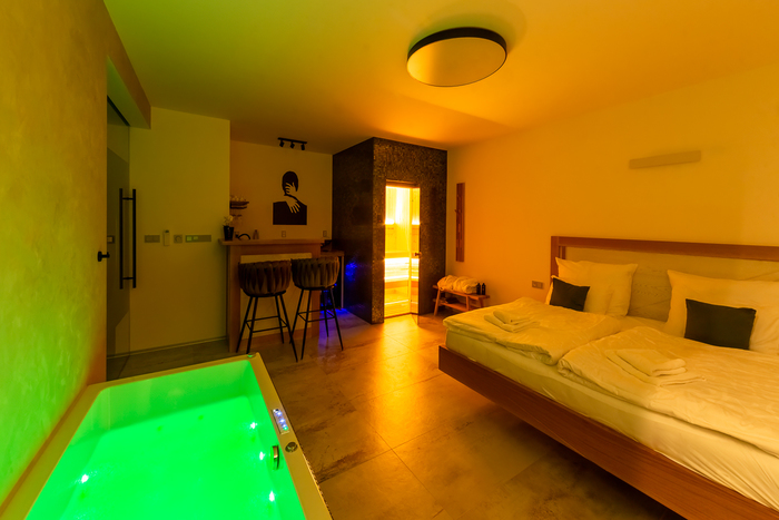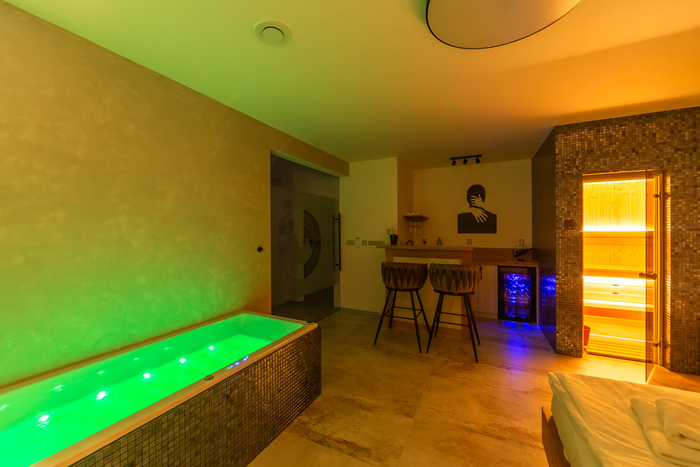 The main advantage of this apartment is the spacious hydro-massage bathtub with chromotherapy and a Finnish sauna, which are ideal for romantic moments or relaxation after a long day.